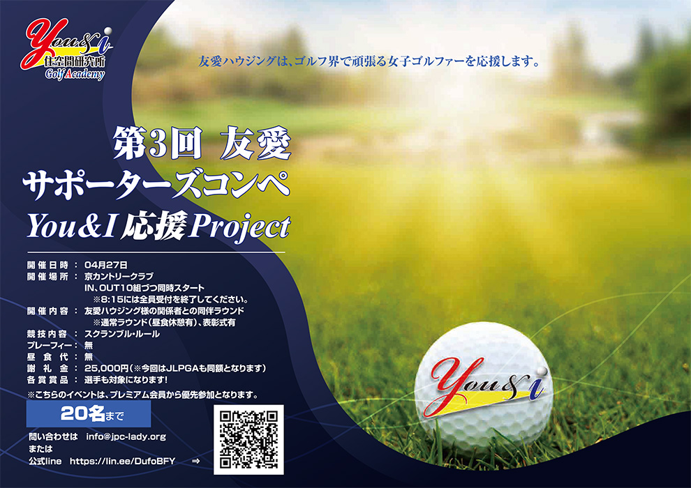 私たちは、ゴルフ界で頑張る女子ゴルファーを応援しています。その一環として、私たちと共に応援していただける方々との交流の場として『You&I 応援Project サポーターズコンペ』を開催していきます。 ご参加いただくことにより選手の育成サポートにご協力いただくと同時に、皆さまとの交流を通じて、選手たちの人間力を磨くことができる場になるものと考えております。皆様の暖かいご支援とご参加をお待ちしております。